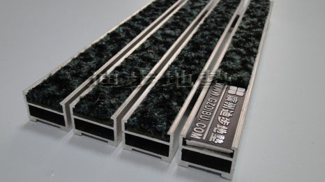 铝框架采用Alcoa高精度纯铝耐腐蚀防锈硬质铝合金,侧面高度达到20MM±1,铝合金壁厚为1.0MM-1.5MM-2MM-2.5MM-3.5MM,,其承重力在标准滚动下每平方可达1500kg-2500kg-4000kg-6000kg不变形,承受力强。面料采用100%PA,底PVC,毛重约800g/㎡,总重3160g/㎡,毛高5.4毫米,总厚度7.6毫米,使用等级EN1307等级3,5尺寸稳定性EN986小于1%,水洗牢固性ISO105E014-5,耐磨性ISO105*124-5,吸水性6034约4.81/㎡,防火性B3810B1-Q1,色牢性ISO 105 B027.5,面料色彩丰富,可根据客户需要灵活搭配。配件:锁扣为Sus304不锈钢锁扣,钢丝为特殊处理的防锈包塑钢丝。底部采用900系统制成两边支撑力大,更能够完美保持地垫的高度一致。地垫放置于高级石材或地砖坑槽内。避免了传统地毯与地面石材的摩擦,能延长石材面板保护膜的寿命同时有效保护地面石材的表面光滑度。