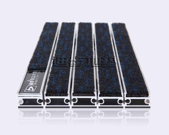 铝框架采用Alcoa高精度纯铝耐腐蚀防锈硬质铝合金,侧面高度达到20MM±1,铝合金壁厚为1.0MM-1.5MM-2MM-2.5MM-3.5MM,,其承重力在标准滚动下每平方可达1500kg-2500kg-4000kg-6000kg不变形,承受力强。面料采用纱线材料:100%PA,底:PVC,纱线重:±950g/㎡,总重:±3900g/㎡,纱线高:±5mm,总厚度:±8.5mm,使用等级EN1307:5mm等级3,5,Total height:总高:7mm,尺寸稳定性EN 986:<1%,洗牢固性ISO105 E01:4-5,耐磨性ISO105X12:4-5,吸水性6034:±4.8l/㎡,防火性B3810:B1-Q1,色牢性ISO 105 B02:7.5面料色彩丰富,可根据客户需要灵活搭配。配件:锁扣为Sus304不锈钢锁扣,钢丝为特殊处理的防锈包塑钢丝。底部采用900系统制成两边支撑力大,更能够完美保持地垫的高度一致。地垫放置于高级石材或地砖坑槽内。避免了传统地毯与地面石材的摩擦,能延长石材面板保护膜的寿命同时有效保护地面石材的表面光滑度