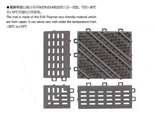 三合一地垫经久耐用,不易磨损 由EVA原料精制而成,可耐高温70度、耐低温-50度,具有耐磨损、耐紫外线、抗腐蚀、抗氧化、防褪色、不易走形等优点,组合式设计可以使局部磨损时进行单块替换,使用寿命长达3-5年! 除尘刮泥功效强劲
