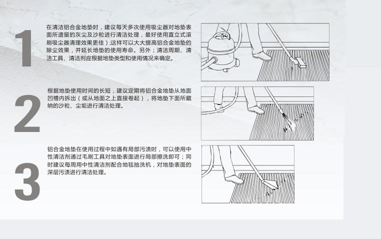 首先,为了让铝合金地垫可以更好的吸附大家鞋底的各种异物,我们需要让地垫本身保持干净。也就说,对于公共场所而言,我们需要每天用吸尘器将地垫表面的灰尘和杂物清除干净。现在,市面上已经推出了地垫的专业吸尘器,使用起来比较方便,而且效果明显。