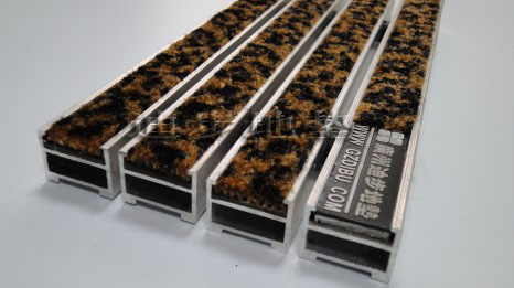 铝框架采用Alcoa高精度纯铝耐腐蚀防锈硬质铝合金,侧面高度达到20MM±1,铝合金壁厚为1.0MM-1.5MM-2MM-2.5MM-3.5MM,,其承重力在标准滚动下每平方可达1500kg-2500kg-4000kg-6000kg不变形,承受力强。面料采用100%PA,底PVC,毛重约800g/㎡,总重3160g/㎡,毛高5.4毫米,总厚度7.6毫米,使用等级EN1307等级3,5尺寸稳定性EN986小于1%,水洗牢固性ISO105E014-5,耐磨性ISO105*124-5,吸水性6034约4.81/㎡,防火性B3810B1-Q1,色牢性ISO 105 B027.5,面料色彩丰富,可根据客户需要灵活搭配。配件:锁扣为Sus304不锈钢锁扣,钢丝为特殊处理的防锈包塑钢丝。底部采用900系统制成两边支撑力大,更能够完美保持地垫的高度一致。地垫放置于高级石材或地砖坑槽内。避免了传统地毯与地面石材的摩擦,能延长石材面板保护膜的寿命同时有效保护地面石材的表面光滑度。