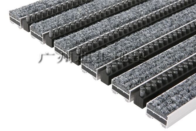 铝框架采用Alcoa高精度纯铝耐腐蚀防锈硬质铝合金,侧面高度达到20MM±1,铝合金壁厚为1.0MM-1.5MM-2MM-2.5MM-3.5MM,,其承重力在标准滚动下每平方可达1500kg-2500kg-4000kg-6000kg不变形,承受力强。面毯采用高分子环保EVA材料,表面毛刷100%PA尼龙材料可在-30°+70°范围内正常使用该产品耐冲击可吸音之硬植毛刷具有超强的刮沙、耐磨,抗倒伏性多种功能。底部采用900系统制成两边支撑力大,更能够完美保持地垫的高度一致。地垫放置于高级石材或地砖坑槽内。避免了传统地毯与地面石材的摩擦,能延长石材面板保护膜的寿命同时有效保护地面石材的表面光滑度。