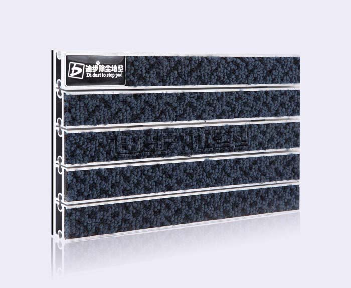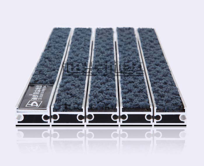 铝框架采用Alcoa高精度纯铝耐腐蚀防锈硬质铝合金,侧面高度达到20MM±1,铝合金壁厚为1.0MM-1.5MM-2MM-2.5MM-3.5MM,,其承重力在标准滚动下每平方可达1500kg-2500kg-4000kg-6000kg不变形,承受力强。面料采用毯面:尼龙、背衬:发泡背衬、结构:簇状圈丝堆积、阻燃性:B、耐候性:>6级、抗静电性能:7.0kv、防滑性能:R12、总重量:3.5千克/M2/厚度:8.1mm底材质 :PVC面料色彩丰富,可根据客户需要灵活搭配。配件:锁扣为Sus304不锈钢锁扣,钢丝为特殊处理的防锈包塑钢丝。底部采用900系统制成两边支撑力大,更能够完美保持地垫的高度一致。地垫放置于高级石材或地砖坑槽内。避免了传统地毯与地面石材的摩擦,能延长石材面板保护膜的寿命同时有效保护地面石材的表面光滑度。 强承托力的铝合金镶条。 3M专利的双重纤维面料,小纤维的刮除水份,大纤维刮除泥砂。灵活强抗拉力的钢丝绳。垫衬增强持久耐用性。橡胶嵌底缓冲。 颜色:烟灰、纯灰、洋红、栗棕、海蓝、墨绿。尺寸:根据客户要求定制。