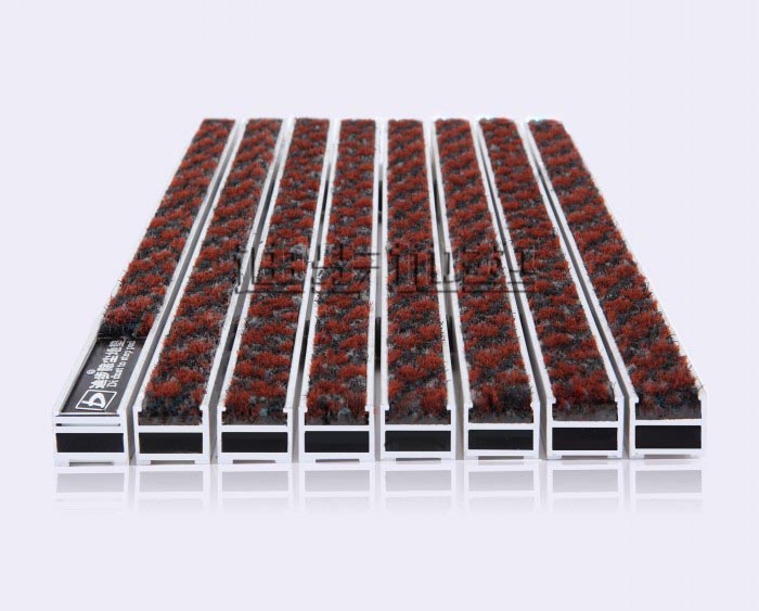 baan邦纳:红色 baan邦纳列技术参数: 铝框架采用Alcoa高精度纯铝耐腐蚀防锈硬质铝合金,侧面高度达到20MM±1,铝合金壁厚为1.0MM-1.5MM-2MM-2.5MM-3.5MM,,其承重力在标准滚动下每平方可达1500kg-2500kg-4000kg-6000kg不变形,承受力强。面料采用Surface:ISO 2424/DIN 61151、尼龙,纱线pile yarn:CEE83/623、100%尼龙,纱线pile yarn:CEE83/623、100%尼龙,底backing:ISO 2424、PVC,底backing:ISO 2424、PVC,簇绒/平米Tufts/㎡:ISO1763、96000,毛高pile height:ISO 1776/DIN54325、6.0mm,毛重pile weight:ISO8543、1000g/㎡,总高度total height:ISO1765/DIN53855、9.2mm,总重量total weight:ISO8543/DIN53854、3650g/㎡,尺寸稳定性dimensional change:ISO 2551/DIN 54318、通过pass,隔音性sound insulationISO 140/8 DIN52210、通过pass,阻燃性Flammability rating:BS4790 DIN4102 T14、B2/ta/t2 pass通过B2/tat2面料色彩丰富,可根据客户需要灵活搭配。配件:锁扣为Sus304不锈钢锁扣,钢丝为特殊处理的防锈包塑钢丝。底部采用900系统制成两边支撑力大,更能够完美保持地垫的高度一致。地垫放置于高级石材或地砖坑槽内。避免了传统地毯与地面石材的摩擦,能延长石材面板保护膜的寿命同时有效保护地面石材的表面光滑度。 |
