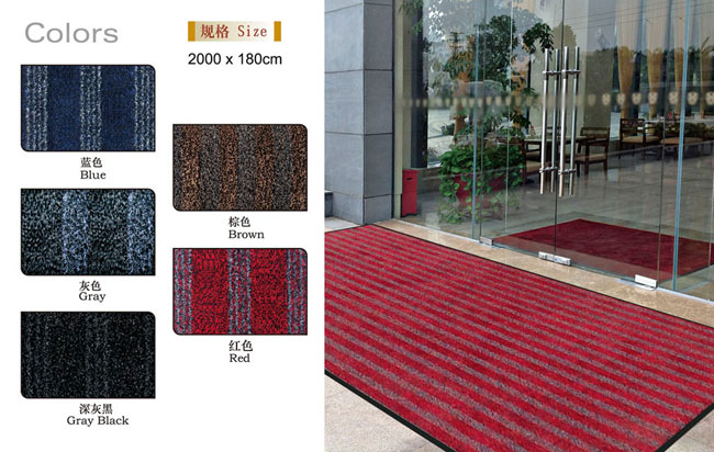 Senas赛纳斯PVC卷材地垫:割绒的工艺有着高强度尼龙粗纤维耐磨混合结构、具有超强的刮沙刮尘以及沉垢功能。高强尼龙纤维有着抗静电抗紫外线确保不褪色不老化特点。强韧的条纹尼龙丝有着高效的除尘吸尘吸水,大方的设计使门口更有气派高档风格,双重组合加强了刮尘效果更具有沉垢的功效使清洁更简单。地垫绒高8MM加上底部用PVC总高10MM绒重950g/平方整体搭配能防滑使用不易走动适合铺设在走道、大厅门口、更能体现的是能搭配多种色彩和花纹更有力配合门口整体设计,使地垫有一面王者的风范。开放式毛绒也是好清洗的只要每天维护用吸尘机进行吸尘效果更好还有定期用地毯洗衣机清洗更干净。