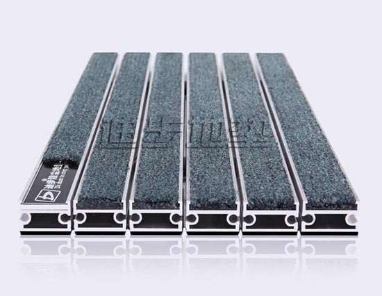 加强型德国900系列技术参数 铝合金地垫铝框架采用Alcoa航空高精度纯铝耐腐蚀防锈硬质铝合金,侧面高度达到20MM±1,铝合金壁厚为2MM±0.1,其承重力在标准滚动下可达2500kg-4000kg/㎡不变形,承受力强。面料采用90%丙纶BCF膨体丝 10%尼龙66单丝,底背:高防腐的UV丙纶长丝,密度:320/520毯基上绒高:7.5mm,阻燃测试等级:GB8624-1997,静电抑制类:GB/T18044-2000级标准,耐磨擦牢度:干、湿摩擦牢度4-5级,室内空气纯度:环保标准GB18587-2001,底部背胶:PP(T30S)聚丙烯颗粒,底部背胶厚度:1.5-1.8mm。面料色彩丰富,可根据客户需要灵活搭配。配件:锁扣为Sus304不锈钢锁扣,钢丝为特殊处理的防锈包塑钢丝。底部采用900系统制成两边支撑力大,更能够完美保持地垫的高度一致。铝合金地垫放置于高级石材或地砖坑槽内。避免了传统地毯与地面石材的摩擦,能延长石材面板保护膜的寿命同时有效保护地面石材的表面光滑度。